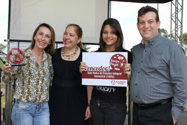 A professora Sandra Rodrigues recebeu o prêmio com a aluna Camila Trindade, que ganhou uma das bolsas de estudos.