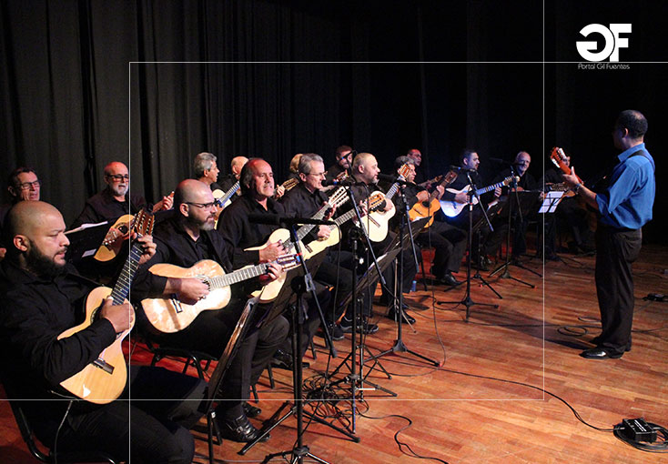 O regente e fundador da Orquestra de Viola Caipira de São Bernardo do Campo, Leandro de Abreu com os músicos que encantaram os convidados