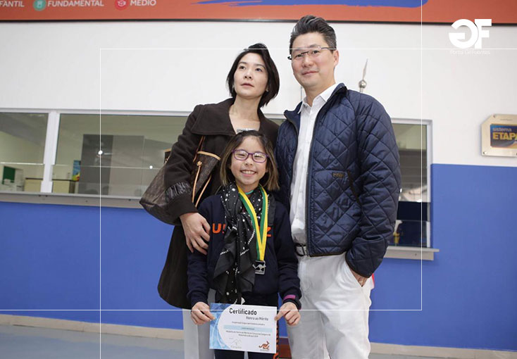 Sandra Saiuri Murakami e Júlio Tadashi Murakami com a filha Aluna Laura Akamine Murakami, que está no 3º ano e recebeu Certificado de Honra ao Mérito