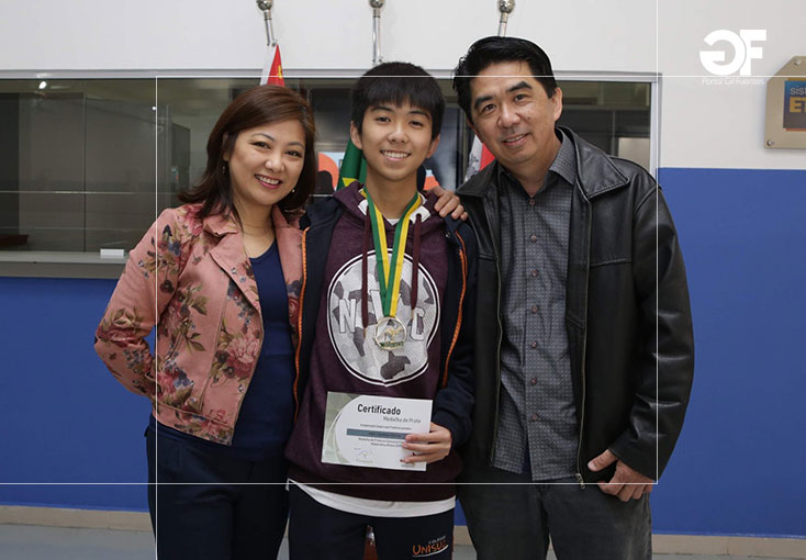 Érica Hirotani e Lauro Hirotani com o filho Enzo Yasumasa Hirotani, que está no 2º ano do Ensino Médio e ficou com a Medalha Prata