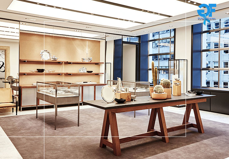 A decoração incorpora detalhes industriais, que reforçam o trabalho manual e artesanal da marca, além das heranças da Tiffany. Toques diferenciados convivem harmoniosamente ao lado dos acabamentos únicos, como mármore e pedra amazonita, refletindo como a nova coleção Home & Acessórios se encaixa no luxuoso cotidiano da joalheria.